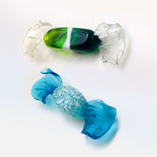 Her new form took getting used to but she managed. She was tiny, not even two inches and made to look, or so the others informed her, like a bit of wrapped candy with a flounce on each end. She enjoyed being displayed but had to fight against jealousy. Other glass objects were larger or more gaudily colored. Sometimes they left the display cases and never returned. How she wanted to travel. Someday, promised her friend, a turquoise glass candy born on the same day.